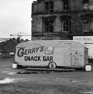 “This Glasgow was a city of ghosts and rubble, its air a miasma of sandstone dust and occluded sunlight. Hugh’s work was local history reframed as National Geographic anthropology… Every totem and trope that made up Glasgow’s visual sense of self was present and correct: the tenements, the cheeky wee boys, the Gorbals back courts, the cranes on the river… Yet the work had to it no civic dimension, it contained nothing that was cherishably Glaswegian, nothing quaint or beguiling: just frank and unblinking assessments of a vanquished city, nursing its shattered jawlines, awaiting the deliverance of some far-distant modern day.” [© Allan Brown, 2013, for Document Scotland].