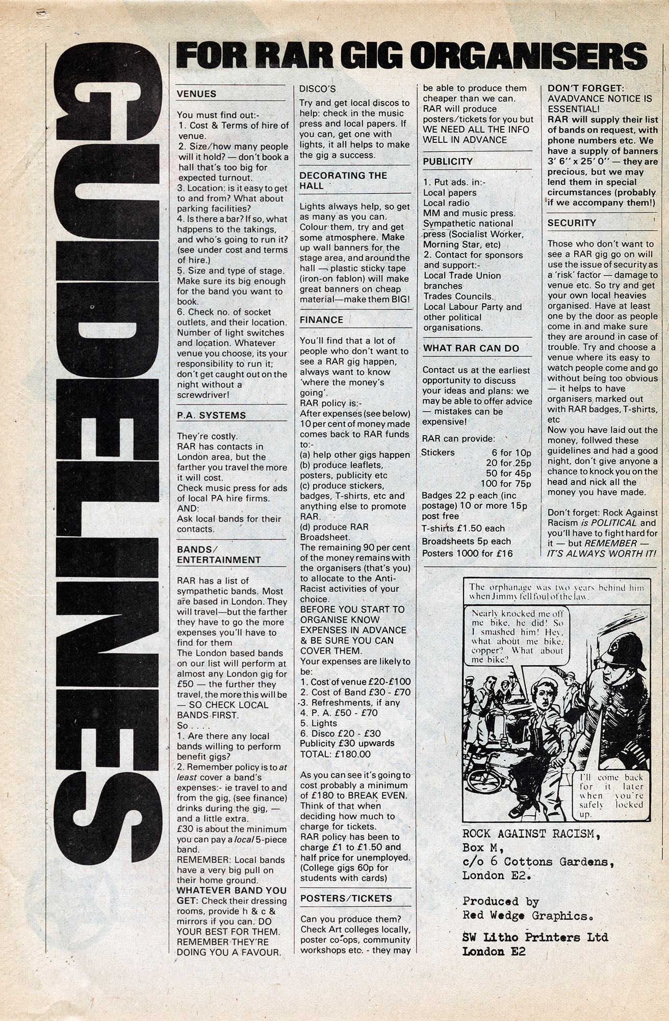 To augment the exhibition Rock Against Racism by Syd Shelton, a display of enlarged covers of the magazine Temporary Hoarding is on in Trongate 103 and various posters and album artwork. 'Shelton was one of the key graphic designers who created the Rock Against Racism fanzine Temporary Hoarding, as well as posters to promote events, which were all done in the punk style of the time. “The graphics, which were done collectively, were very much led by the technology of the time,” he says. “Offset litho had replaced letterpress, which was as liberating to designers as Apple Macs were to be a decade later. Our work was influenced by the Constructivists and montage favourites like John Heartfield. Our tools were the photocopier, the photomechanical transfer camera and a very Heath Robinson American Headlining Machine. Putting together Temporary Hoarding almost always involved at least one all-night session, sometimes with people dropping into the studio with a few beers or to put their two bobs worth into the artwork.' Creative Review, June 2016. p.p1